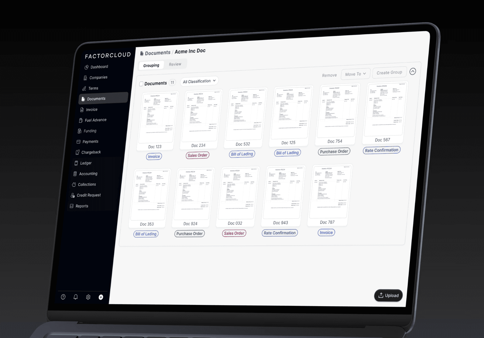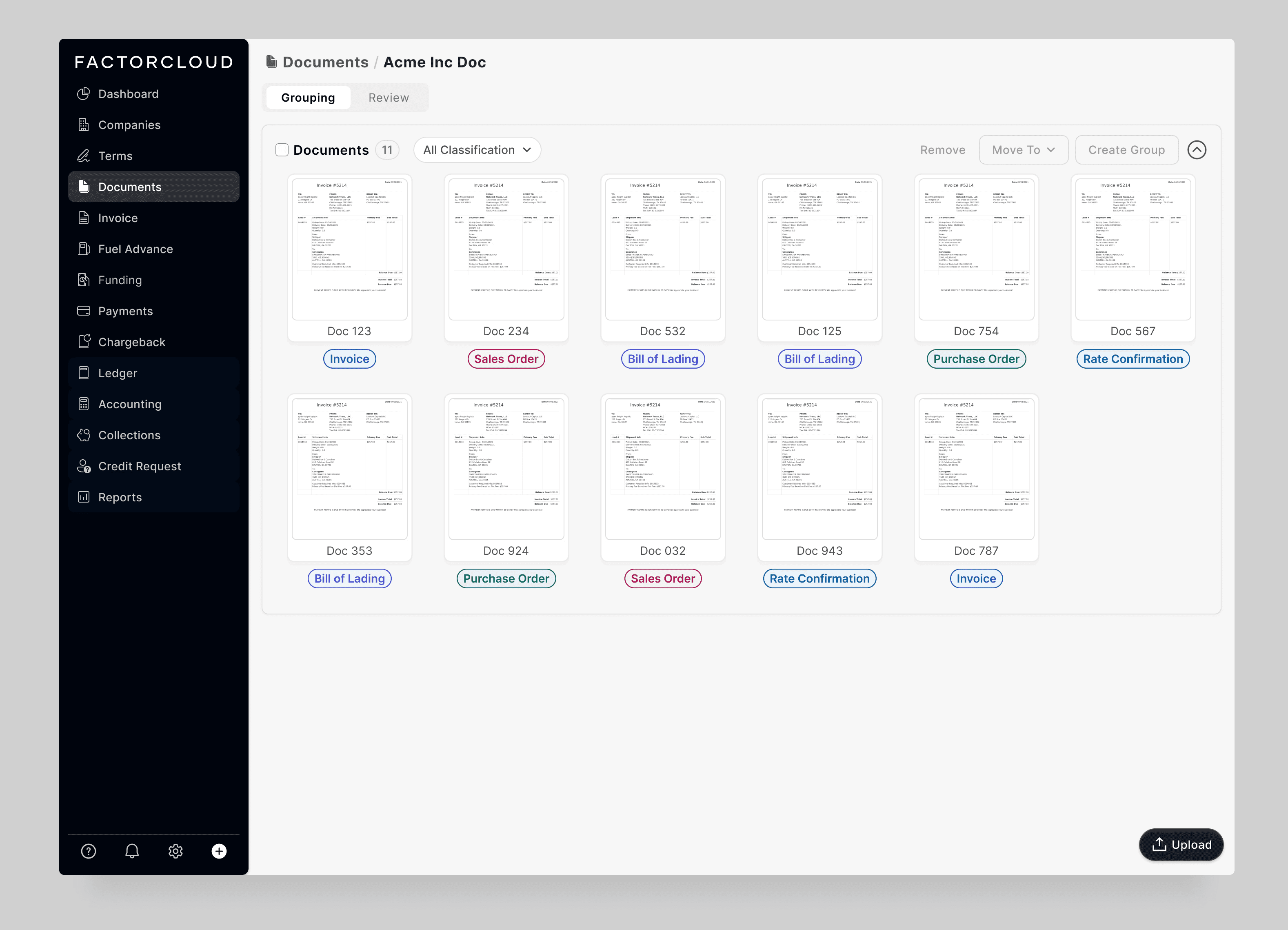 FactorCloud users process funding schedules by organising invoices, purchase orders, rate confirmations, and bills of lading.