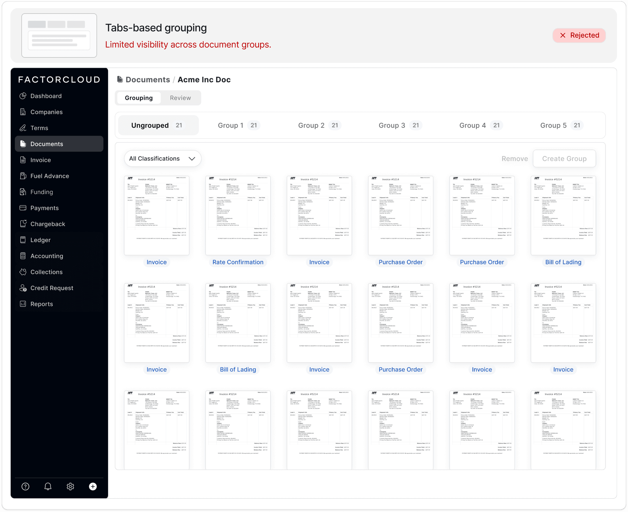 Document management interface for FactorCloud significantly enhances user experience by providing intuitive features like grouping, filtering, and drag-and-drop functionality.